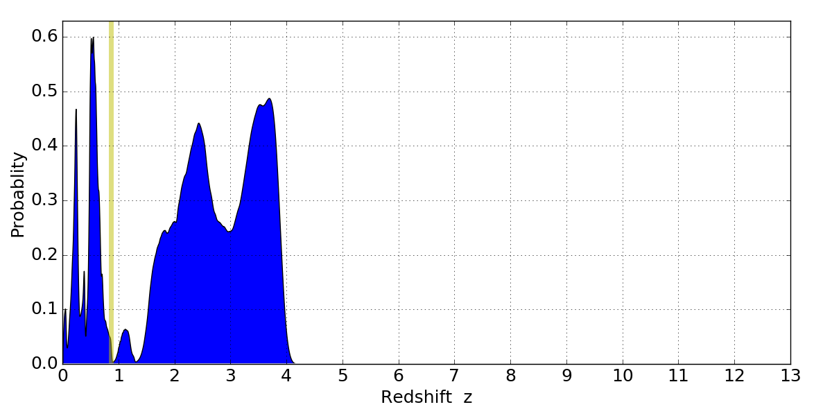 In P(z) plots: Yellow lines mark the cluster redshift z = 0.870,