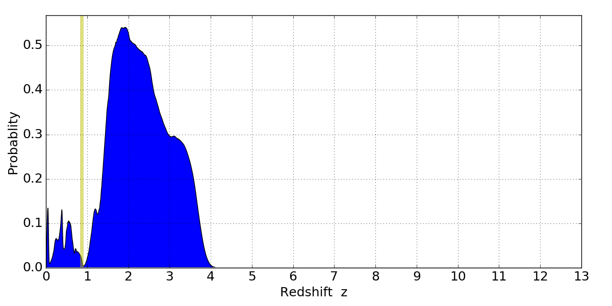 In P(z) plots: Yellow lines mark the cluster redshift z = 0.870,