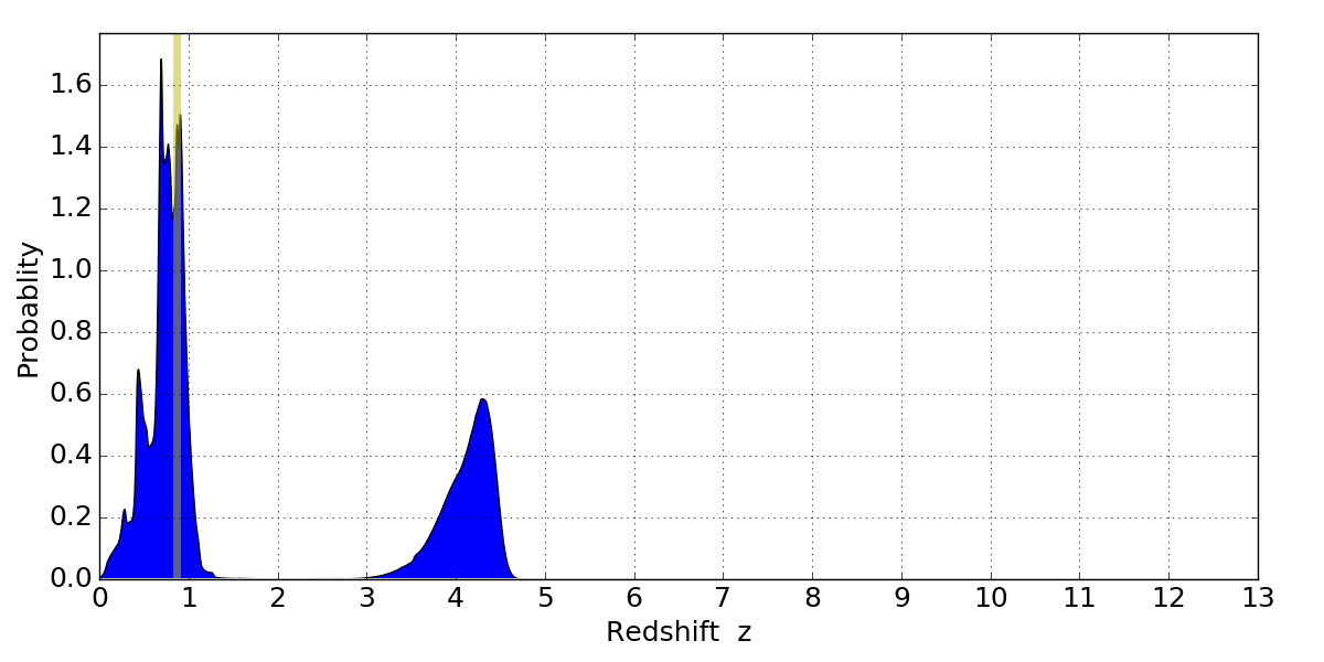 In P(z) plots: Yellow lines mark the cluster redshift z = 0.870,