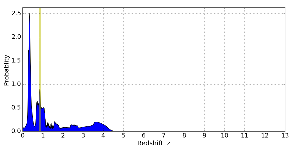 In P(z) plots: Yellow lines mark the cluster redshift z = 0.870,