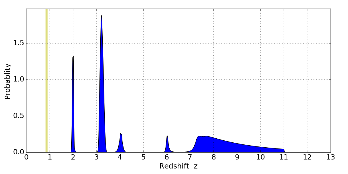 In P(z) plots: Yellow lines mark the cluster redshift z = 0.870,