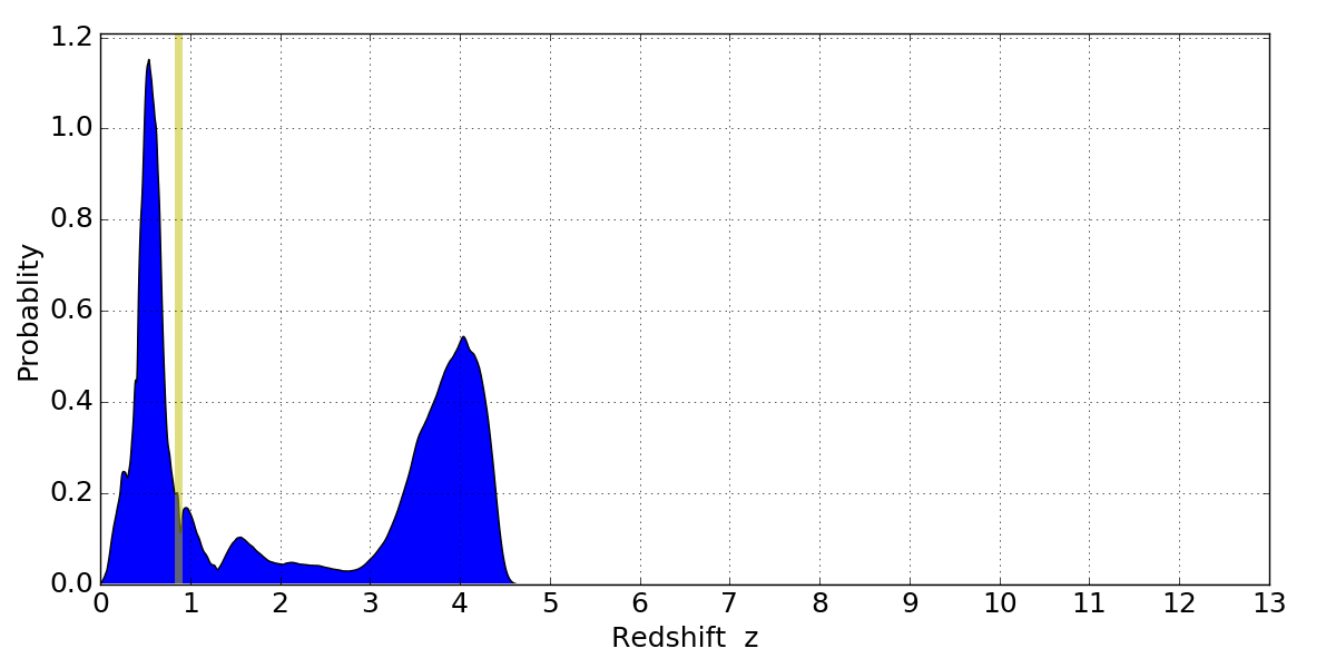In P(z) plots: Yellow lines mark the cluster redshift z = 0.870,