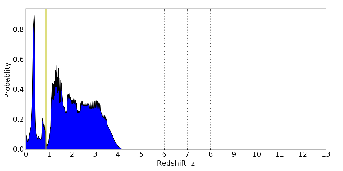 In P(z) plots: Yellow lines mark the cluster redshift z = 0.870,
