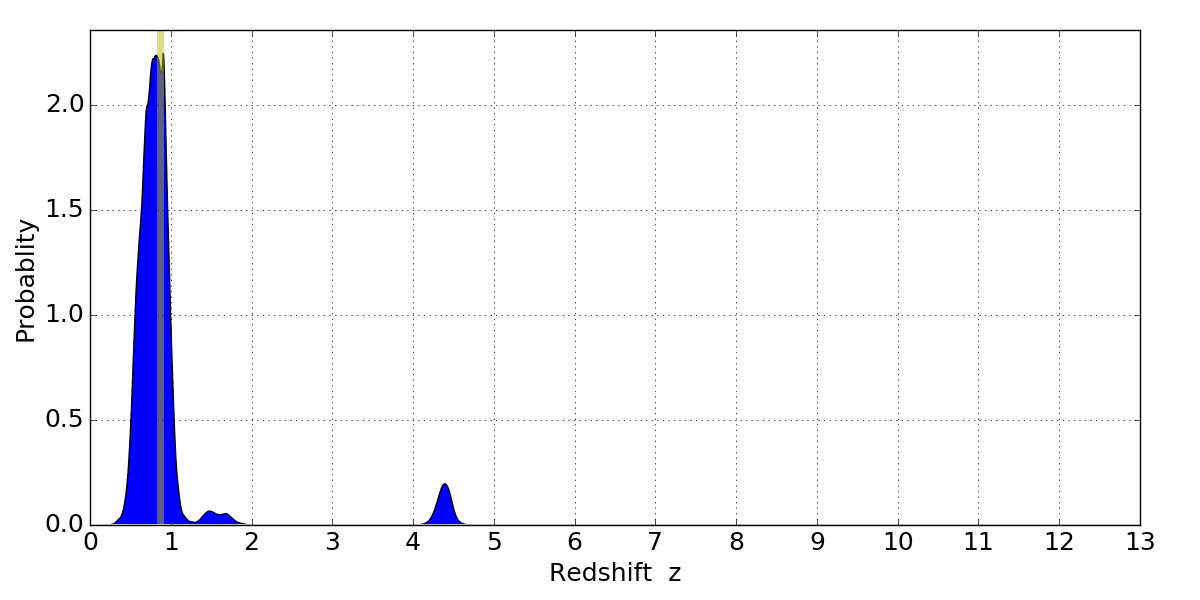 In P(z) plots: Yellow lines mark the cluster redshift z = 0.870,