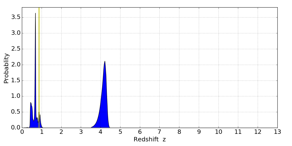 In P(z) plots: Yellow lines mark the cluster redshift z = 0.870,