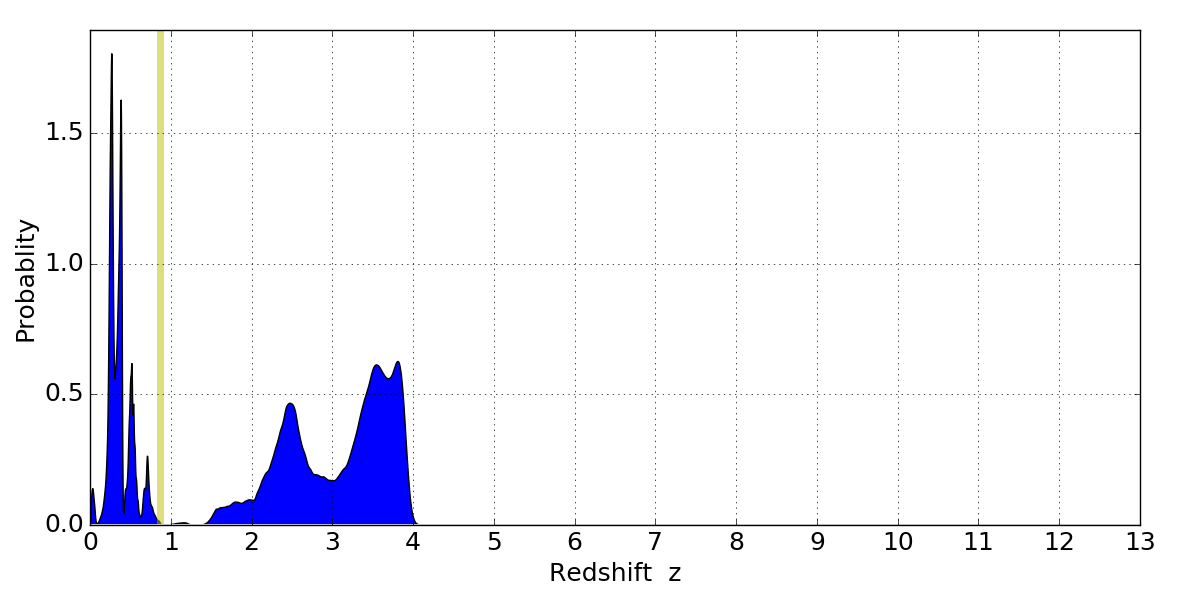 In P(z) plots: Yellow lines mark the cluster redshift z = 0.870,