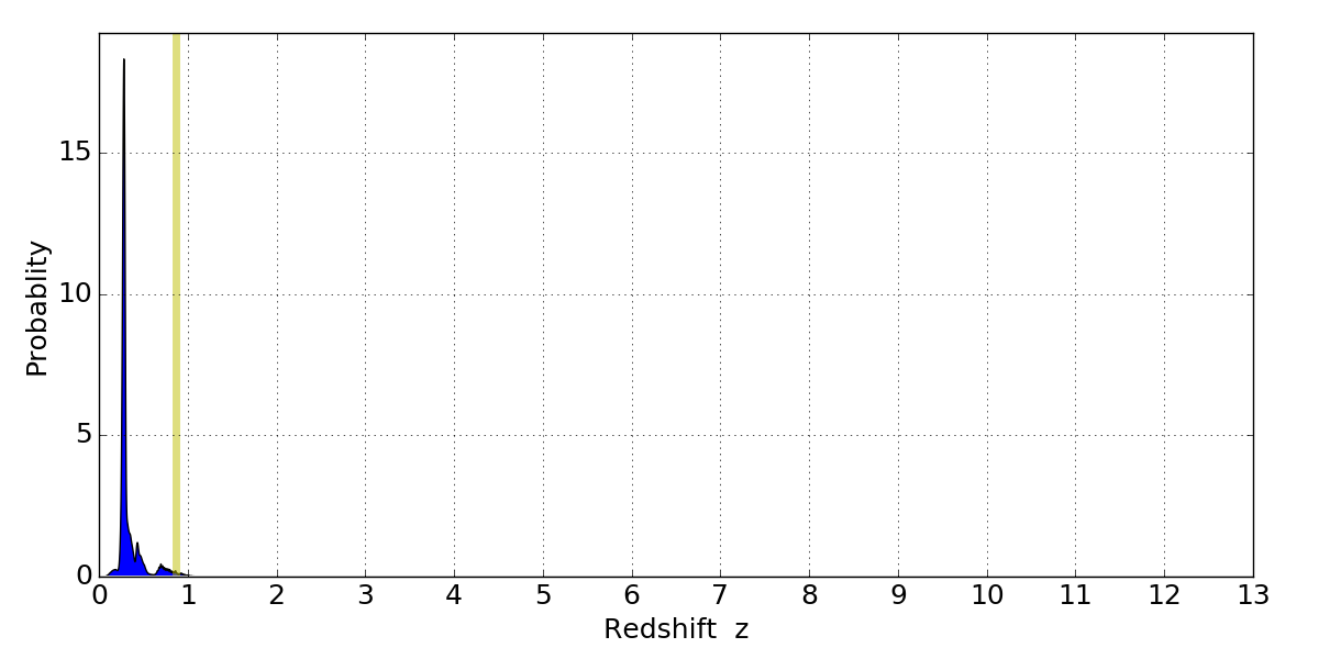 In P(z) plots: Yellow lines mark the cluster redshift z = 0.870,