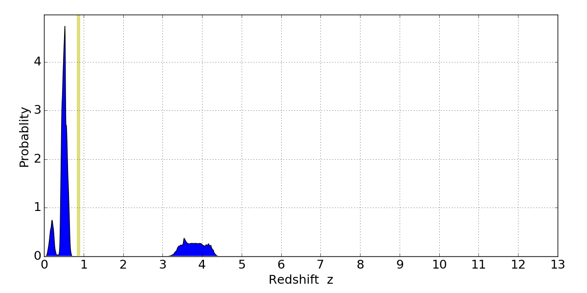 In P(z) plots: Yellow lines mark the cluster redshift z = 0.870,