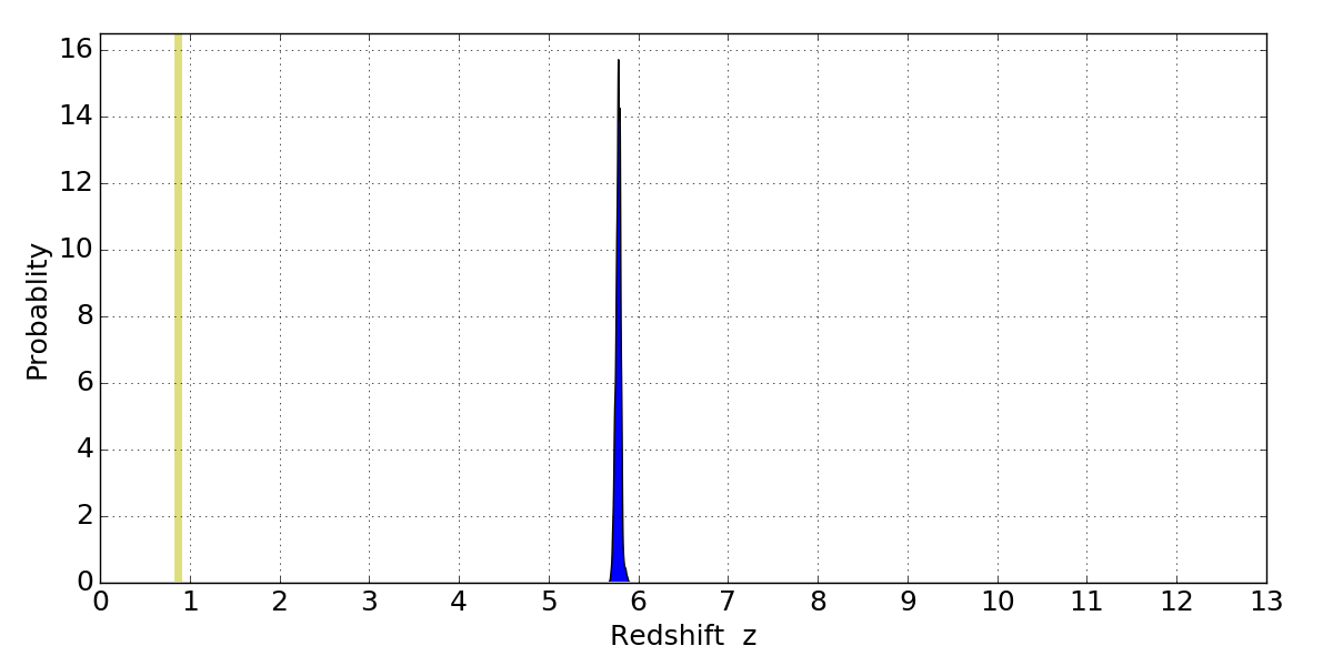 In P(z) plots: Yellow lines mark the cluster redshift z = 0.870,