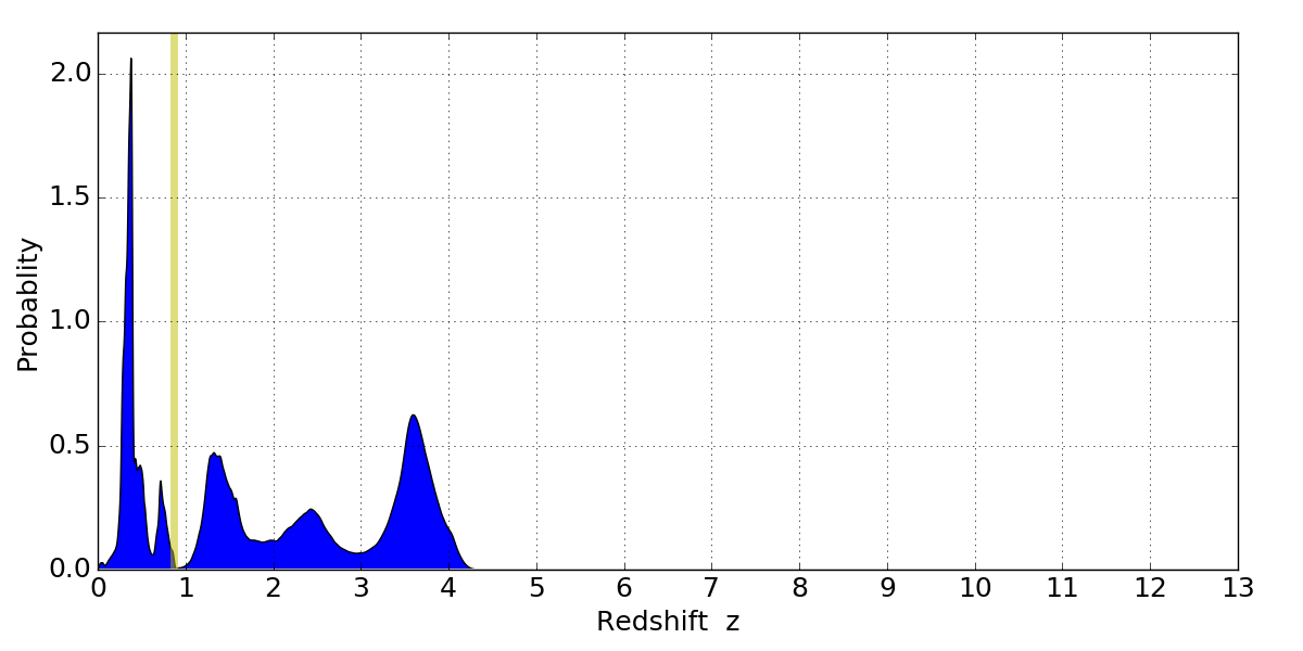In P(z) plots: Yellow lines mark the cluster redshift z = 0.870,