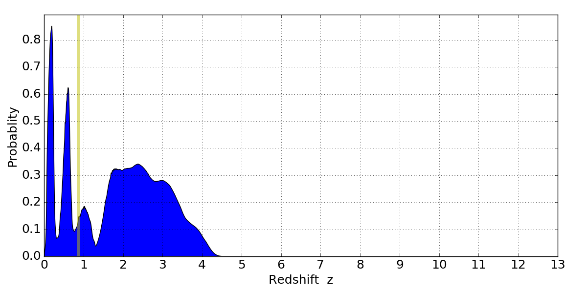 In P(z) plots: Yellow lines mark the cluster redshift z = 0.870,