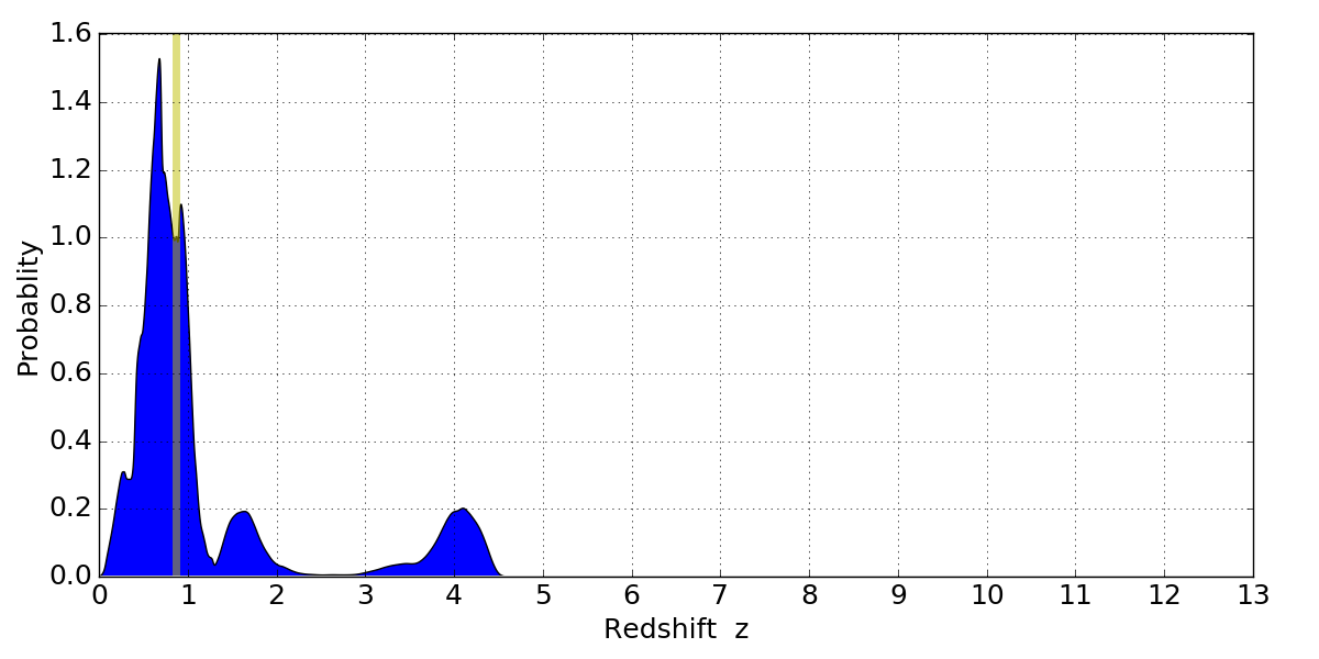 In P(z) plots: Yellow lines mark the cluster redshift z = 0.870,