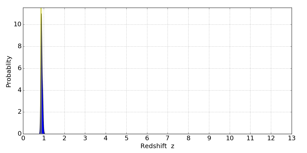 In P(z) plots: Yellow lines mark the cluster redshift z = 0.870,