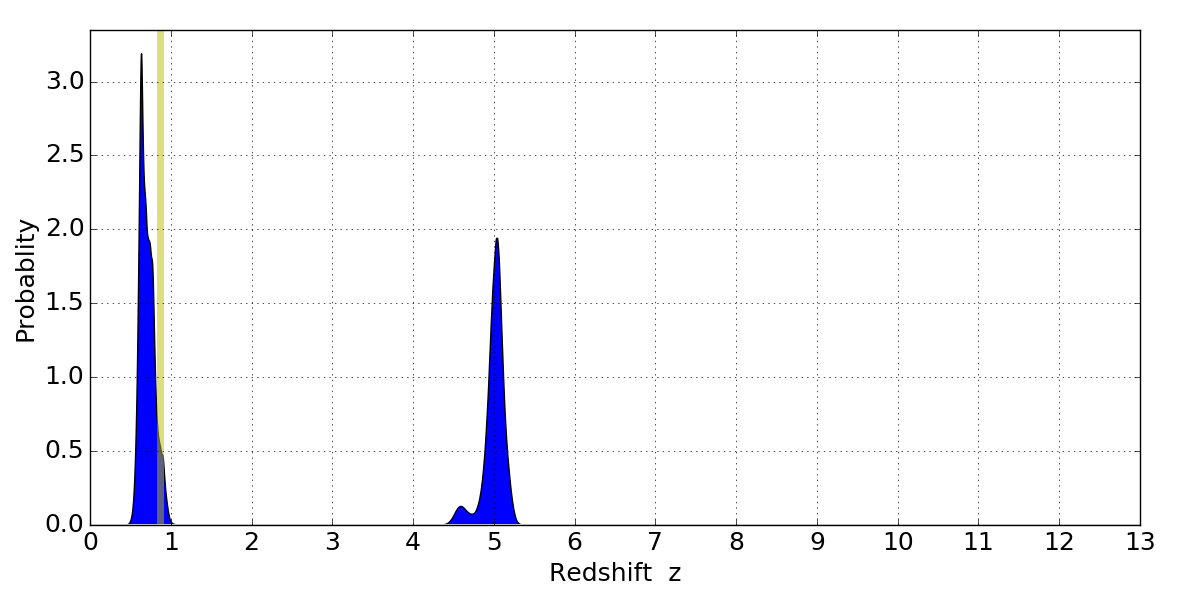 In P(z) plots: Yellow lines mark the cluster redshift z = 0.870,