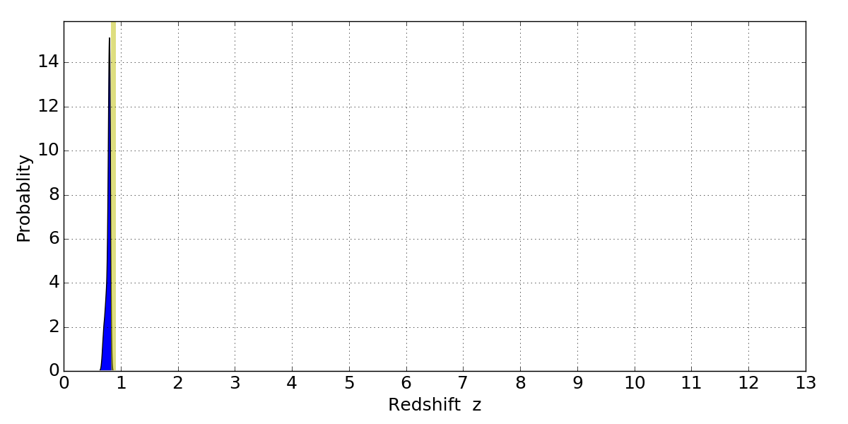 In P(z) plots: Yellow lines mark the cluster redshift z = 0.870,