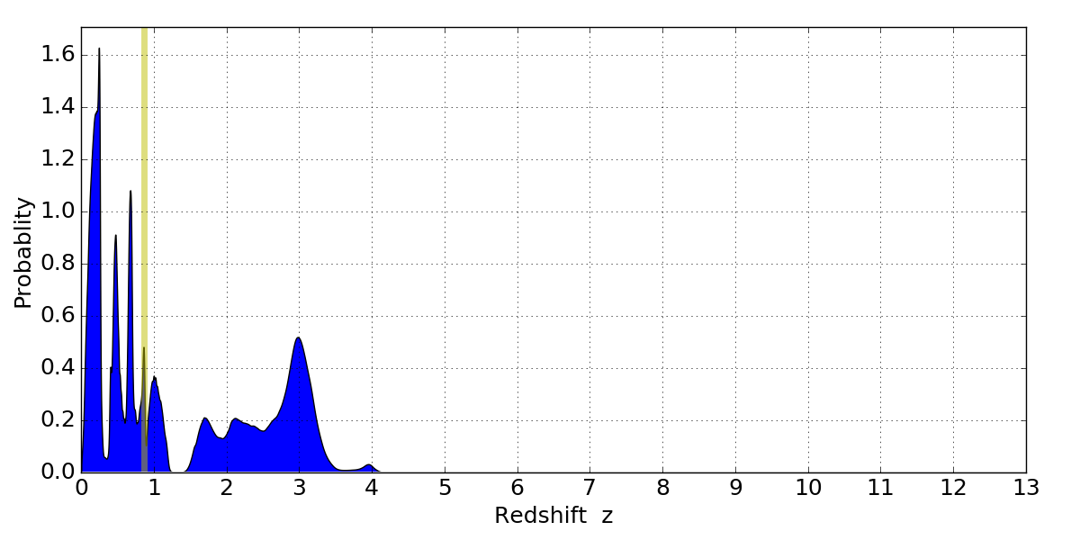 In P(z) plots: Yellow lines mark the cluster redshift z = 0.870,