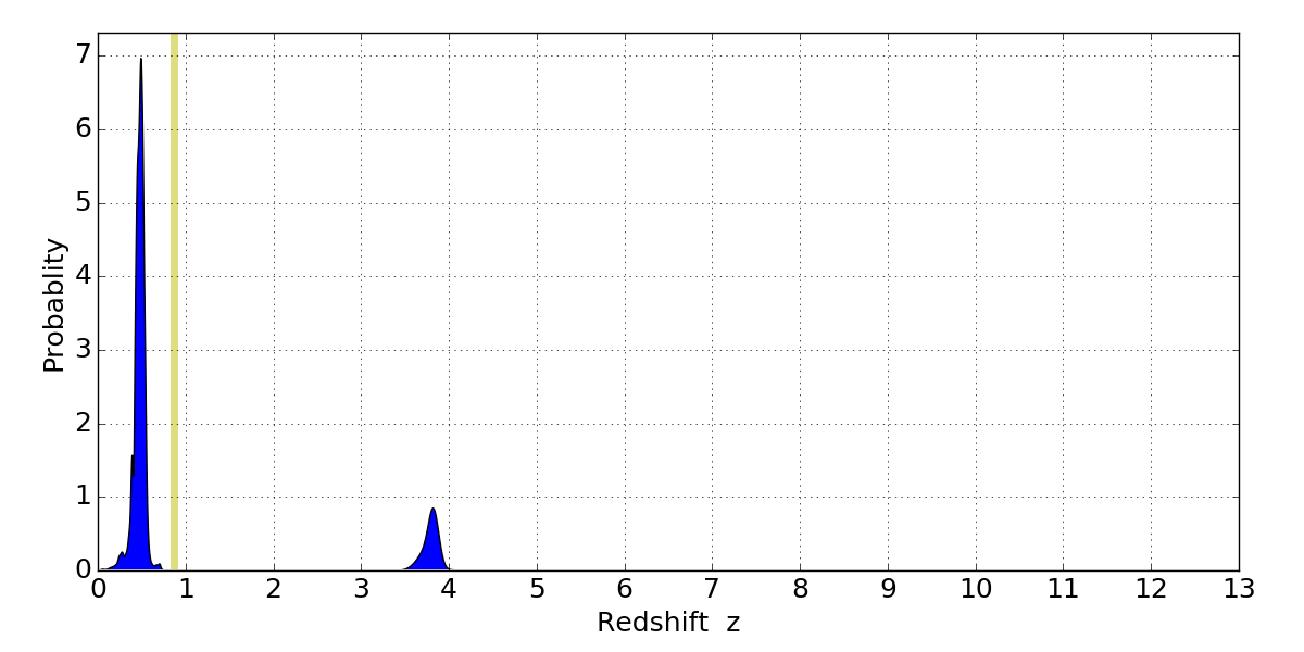 In P(z) plots: Yellow lines mark the cluster redshift z = 0.870,