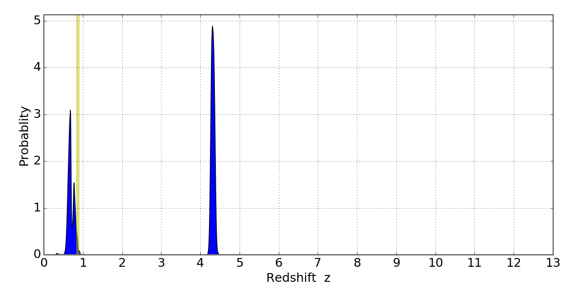 In P(z) plots: Yellow lines mark the cluster redshift z = 0.870,