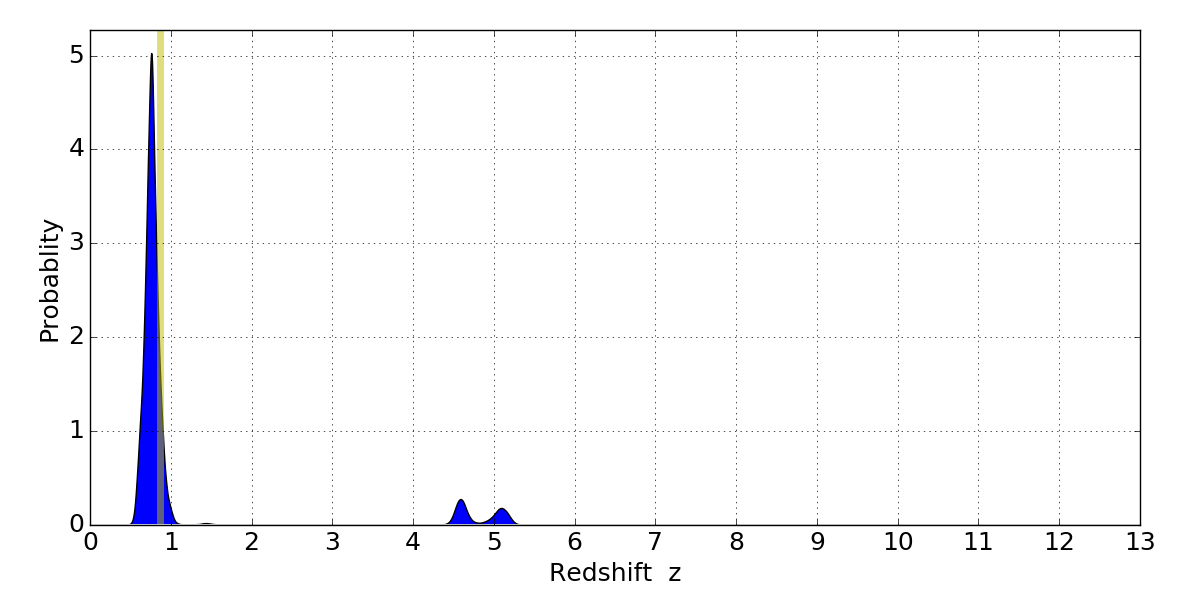 In P(z) plots: Yellow lines mark the cluster redshift z = 0.870,