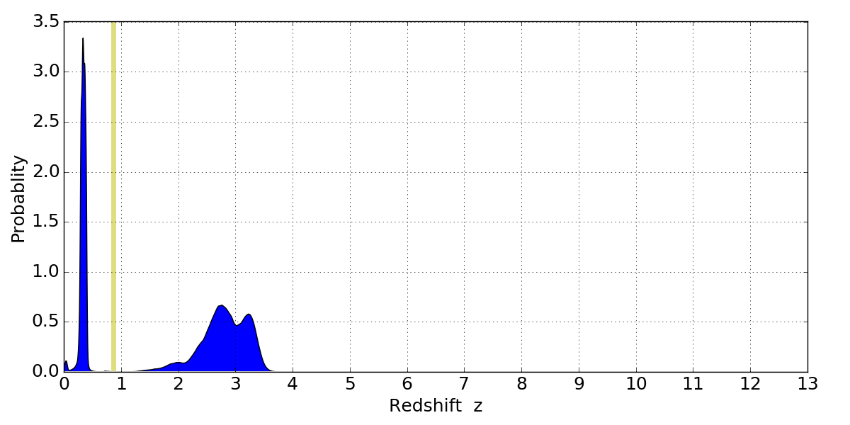 In P(z) plots: Yellow lines mark the cluster redshift z = 0.870,