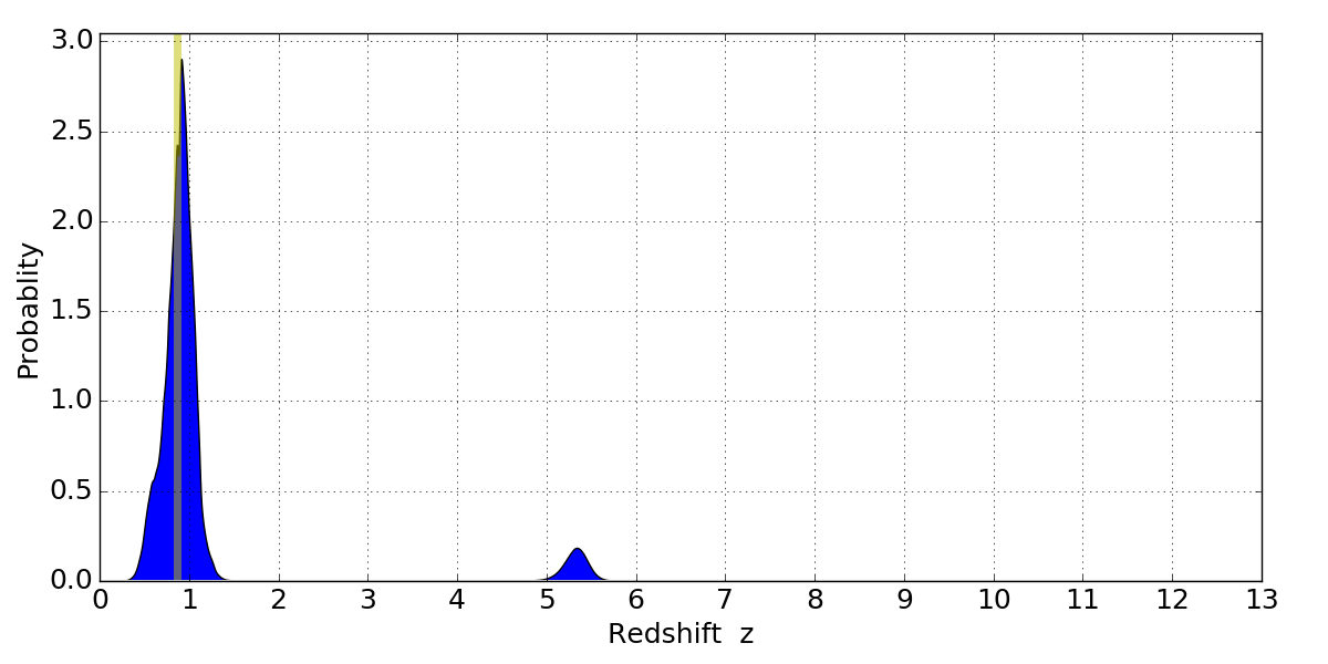 In P(z) plots: Yellow lines mark the cluster redshift z = 0.870,