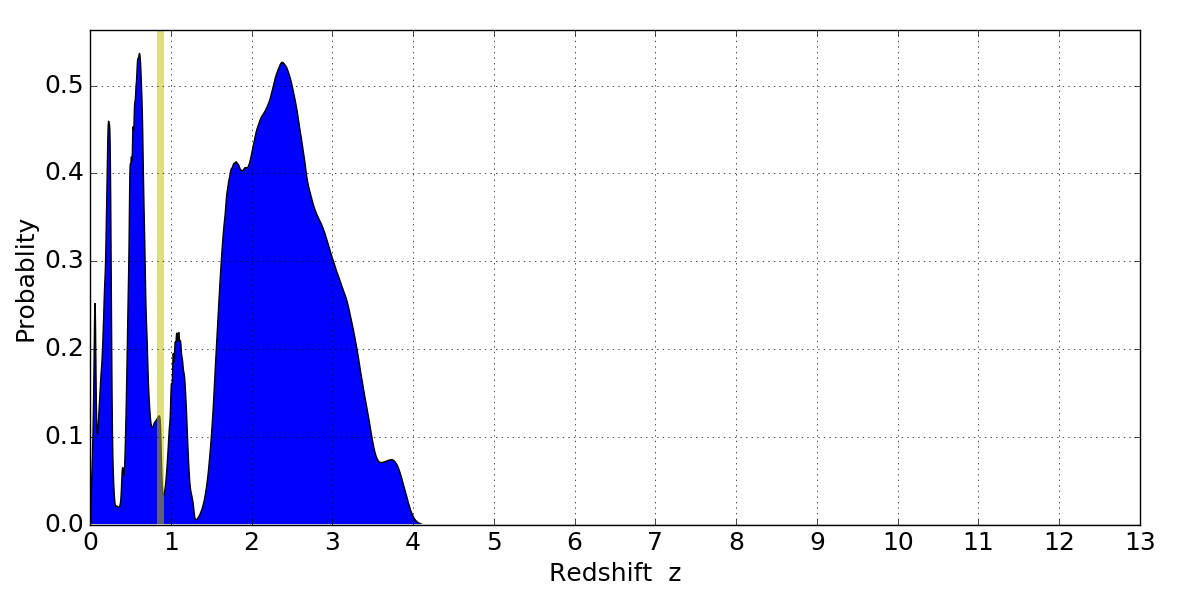 In P(z) plots: Yellow lines mark the cluster redshift z = 0.870,