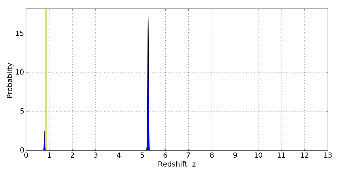 In P(z) plots: Yellow lines mark the cluster redshift z = 0.870,
