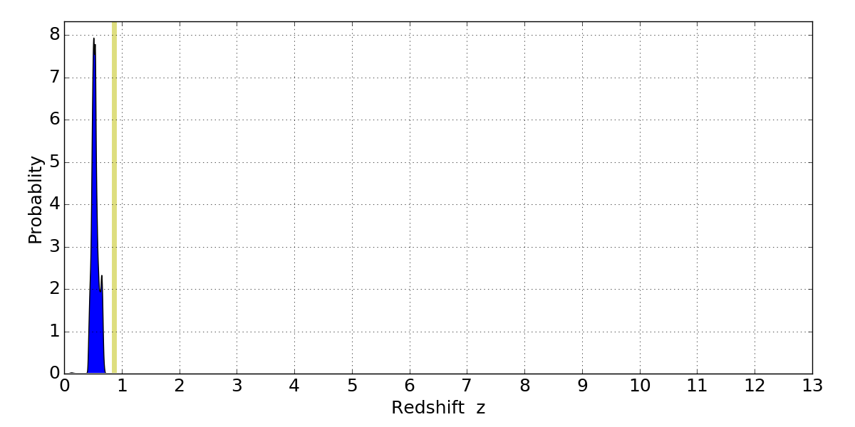 In P(z) plots: Yellow lines mark the cluster redshift z = 0.870,
