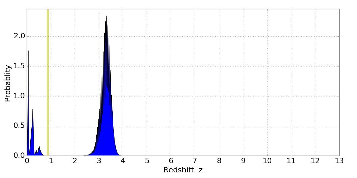 In P(z) plots: Yellow lines mark the cluster redshift z = 0.870,