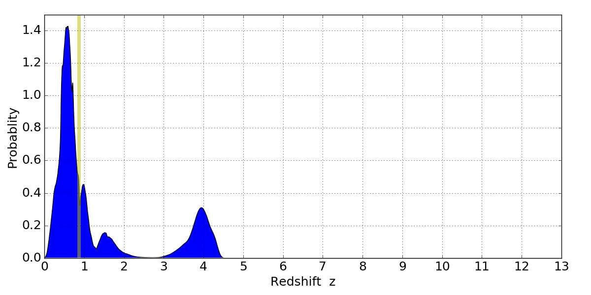 In P(z) plots: Yellow lines mark the cluster redshift z = 0.870,