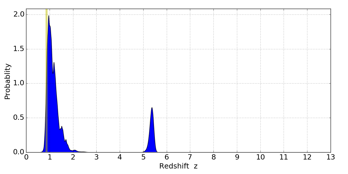 In P(z) plots: Yellow lines mark the cluster redshift z = 0.870,