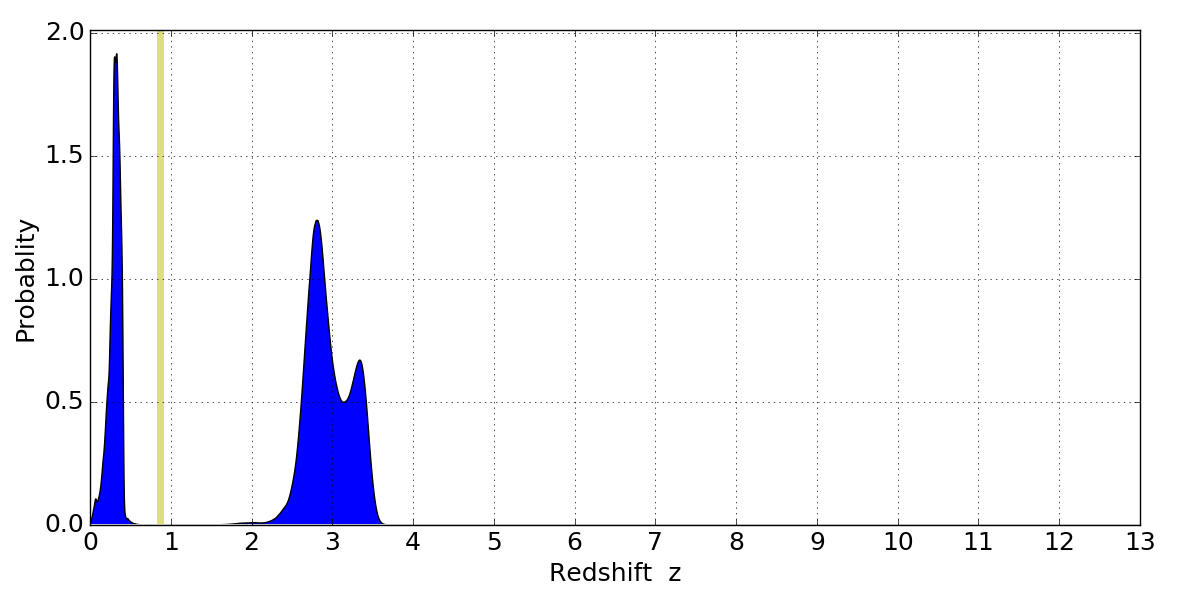 In P(z) plots: Yellow lines mark the cluster redshift z = 0.870,