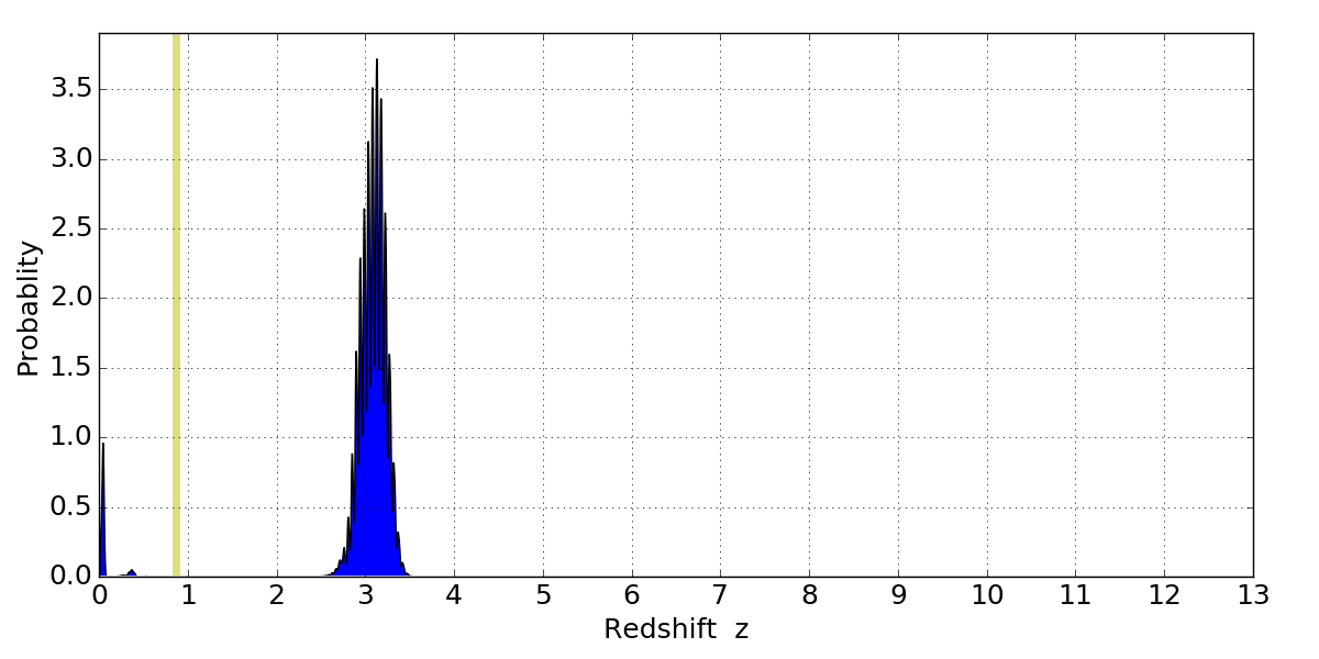 In P(z) plots: Yellow lines mark the cluster redshift z = 0.870,
