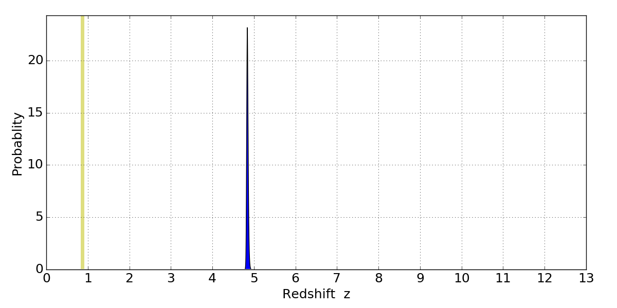 In P(z) plots: Yellow lines mark the cluster redshift z = 0.870,