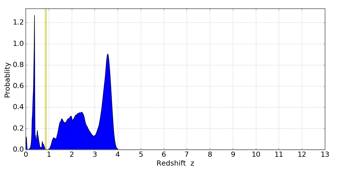 In P(z) plots: Yellow lines mark the cluster redshift z = 0.870,
