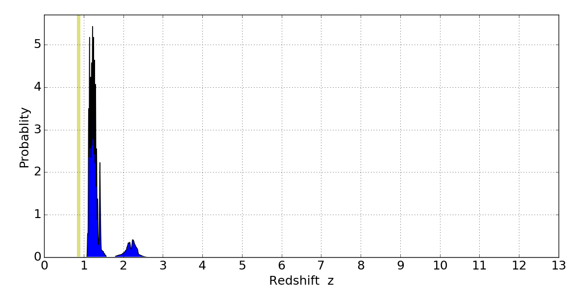 In P(z) plots: Yellow lines mark the cluster redshift z = 0.870,