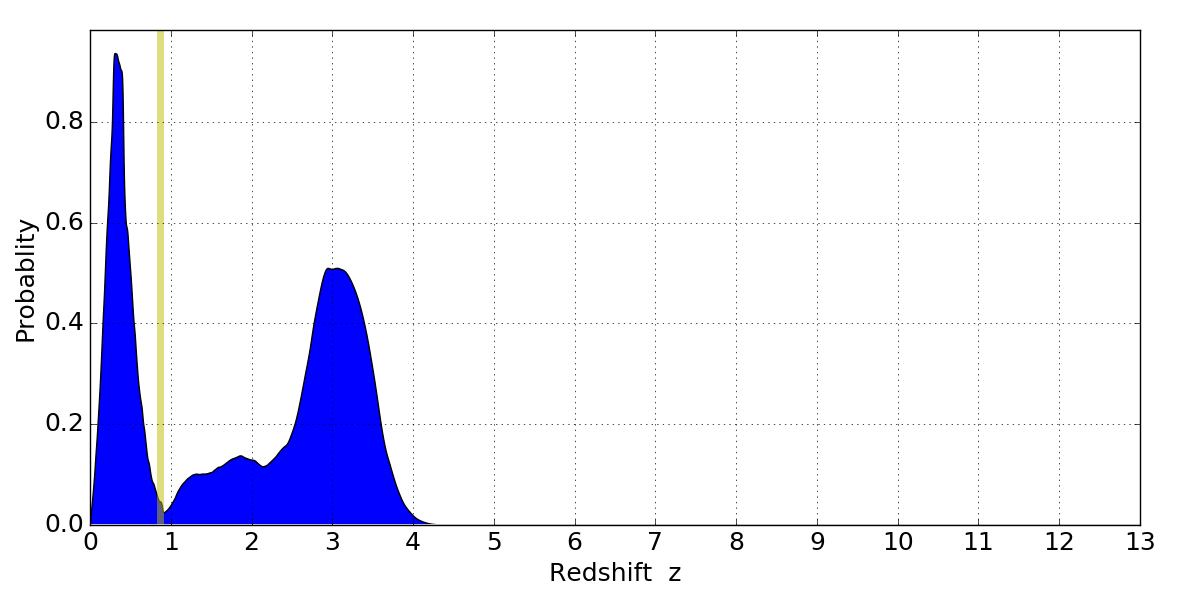 In P(z) plots: Yellow lines mark the cluster redshift z = 0.870,