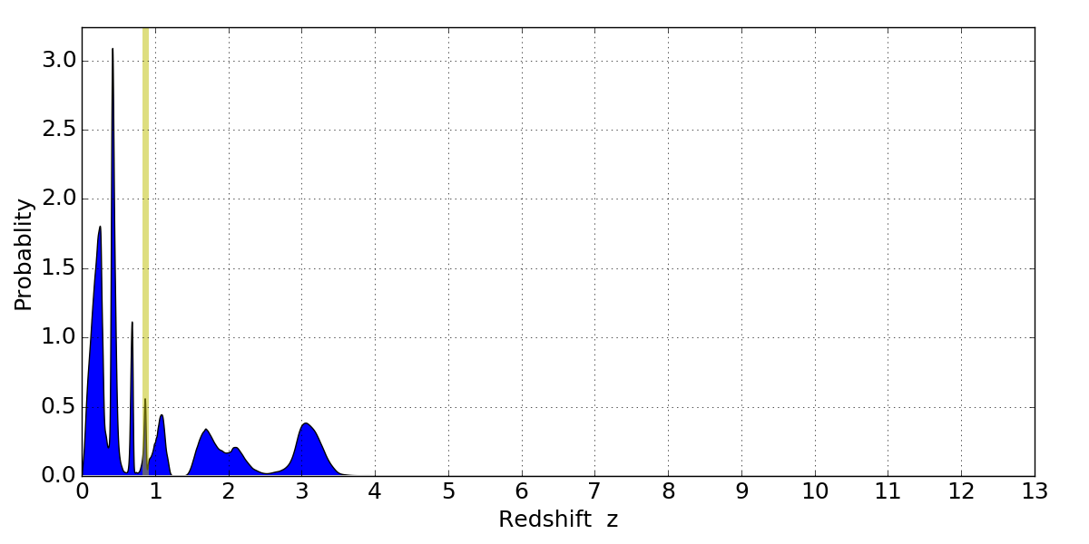 In P(z) plots: Yellow lines mark the cluster redshift z = 0.870,