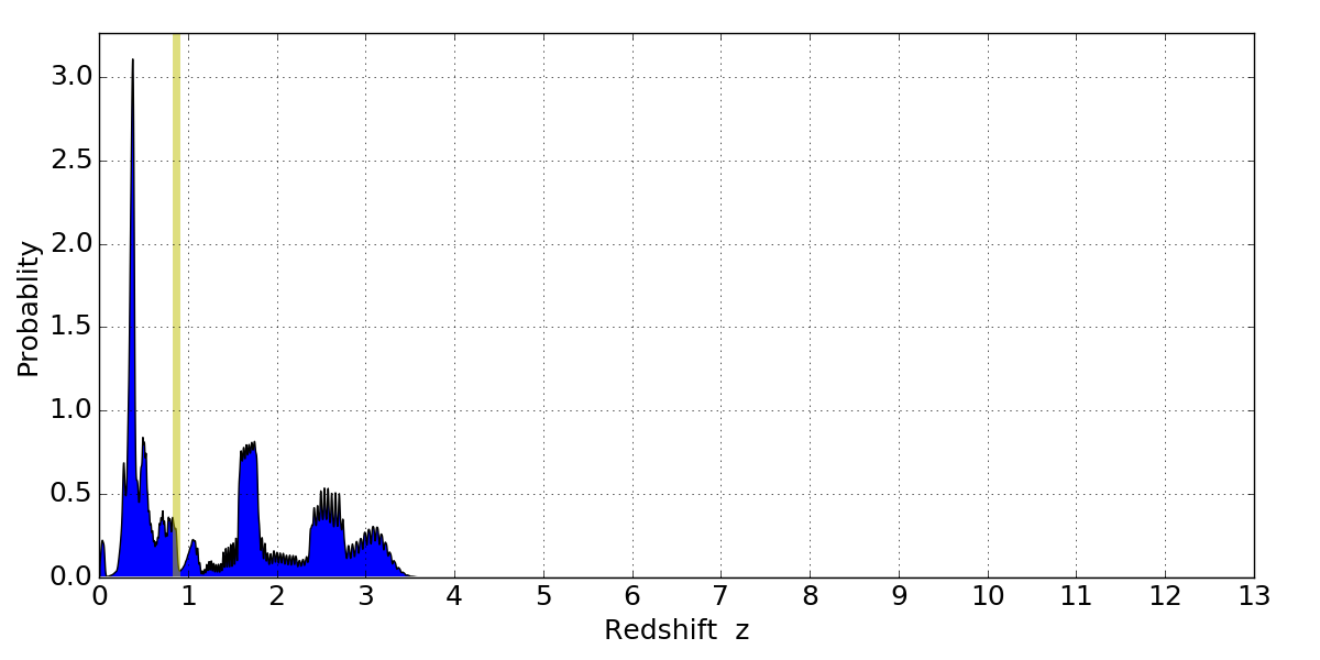 In P(z) plots: Yellow lines mark the cluster redshift z = 0.870,