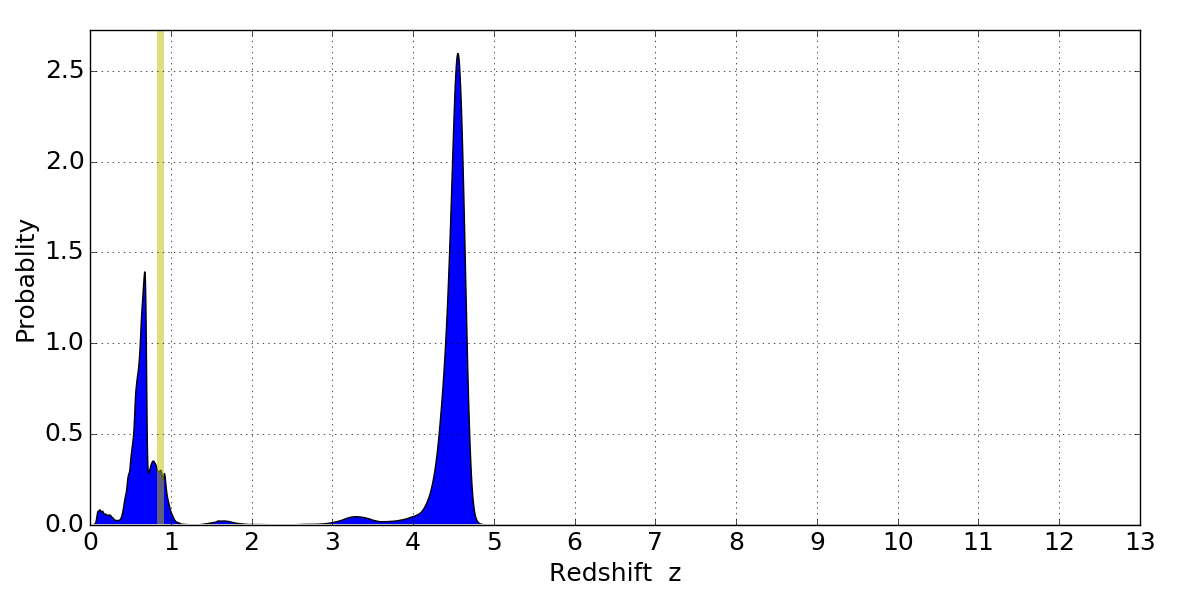 In P(z) plots: Yellow lines mark the cluster redshift z = 0.870,