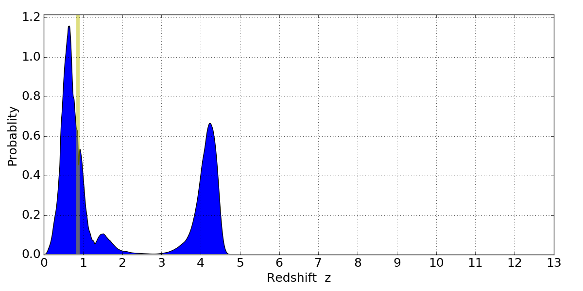 In P(z) plots: Yellow lines mark the cluster redshift z = 0.870,
