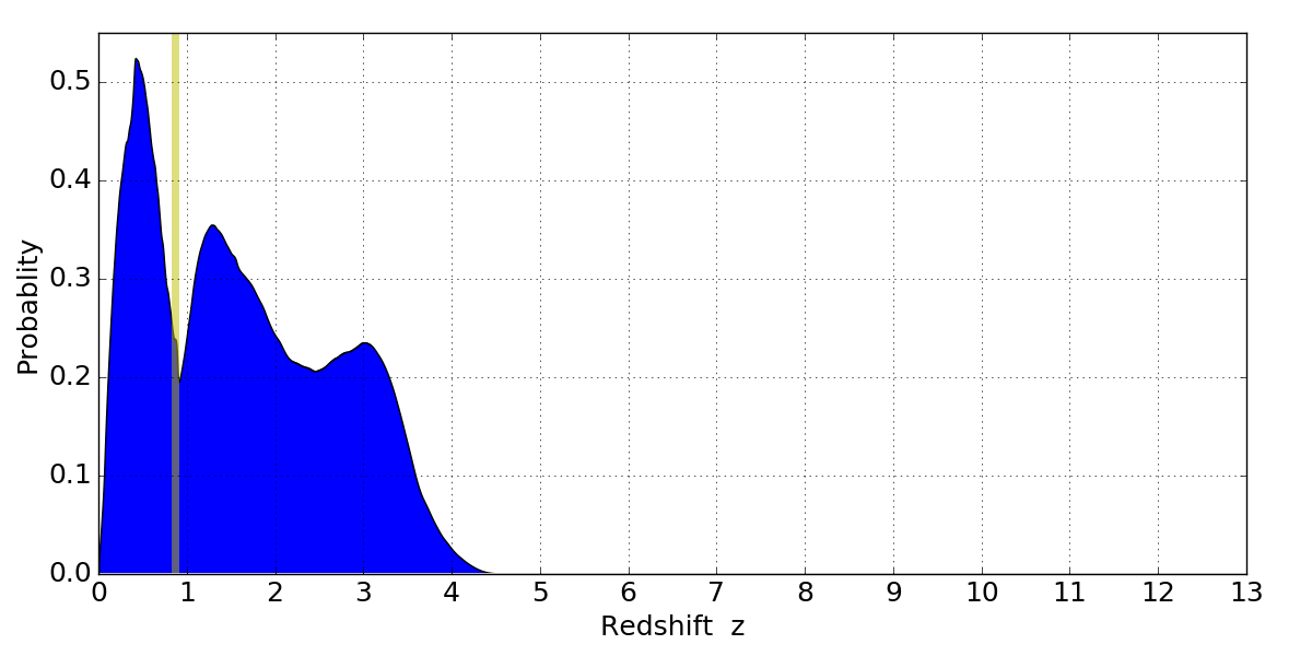 In P(z) plots: Yellow lines mark the cluster redshift z = 0.870,