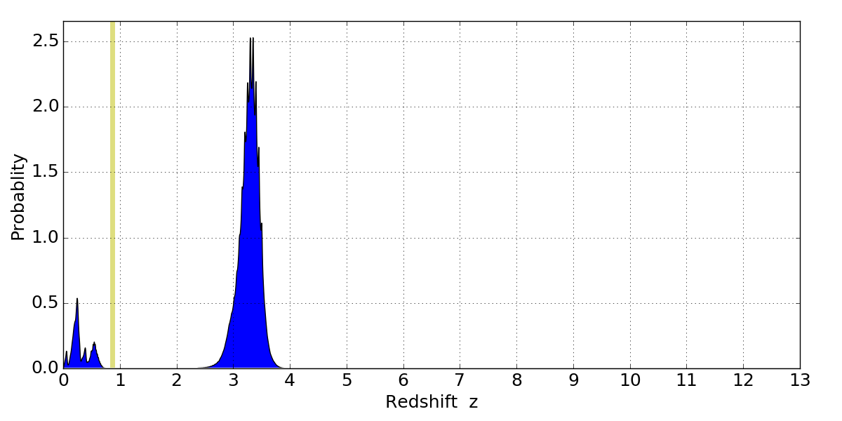 In P(z) plots: Yellow lines mark the cluster redshift z = 0.870,