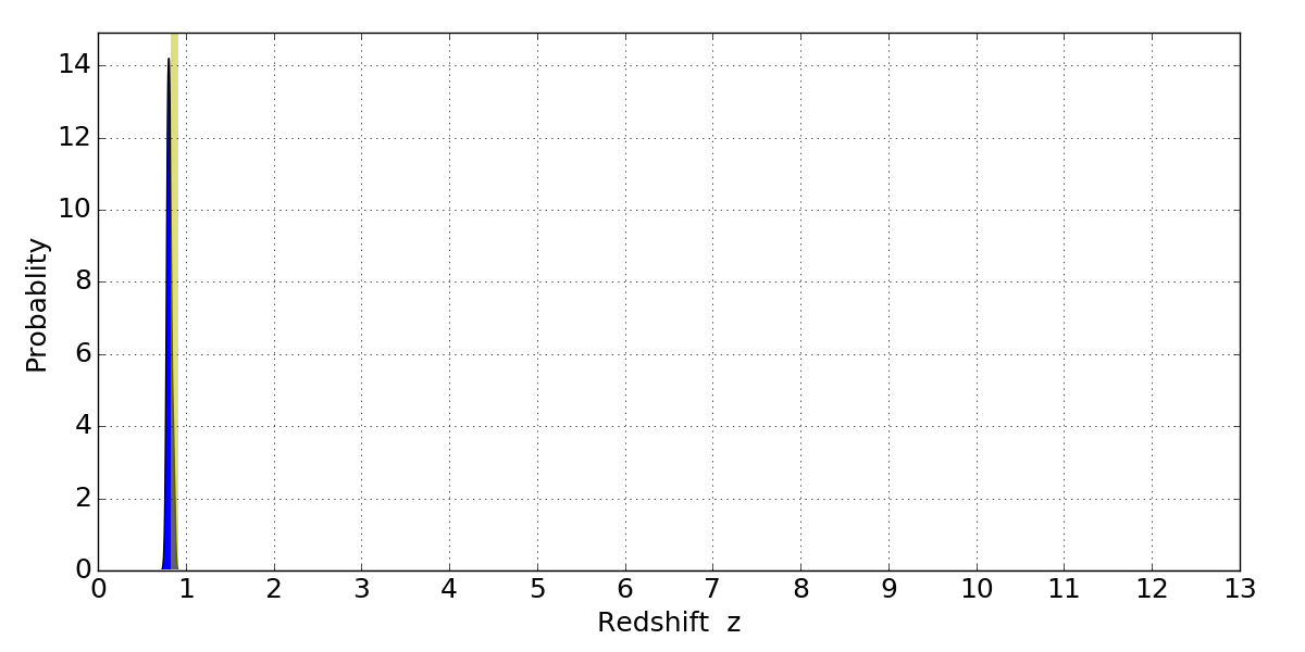 In P(z) plots: Yellow lines mark the cluster redshift z = 0.870,