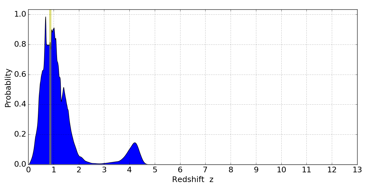 In P(z) plots: Yellow lines mark the cluster redshift z = 0.870,