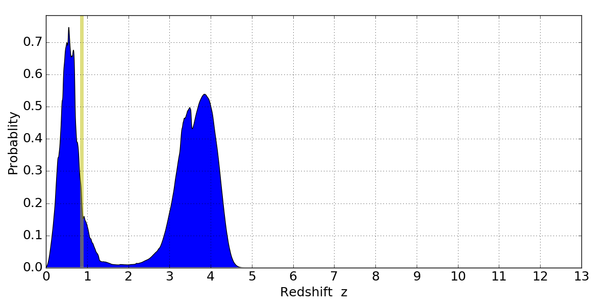 In P(z) plots: Yellow lines mark the cluster redshift z = 0.870,