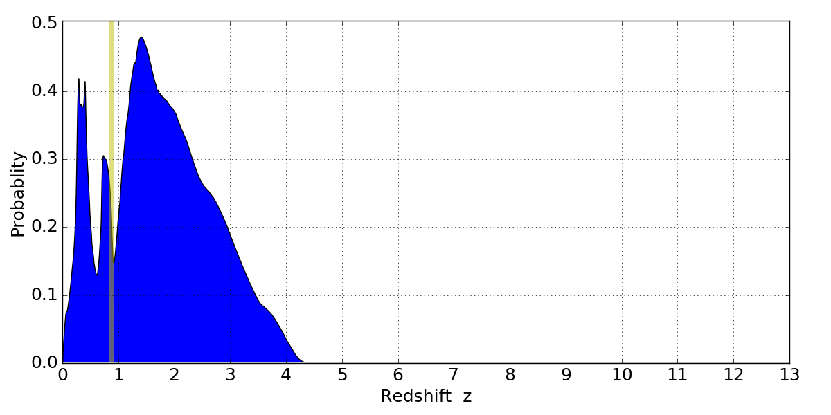 In P(z) plots: Yellow lines mark the cluster redshift z = 0.870,
