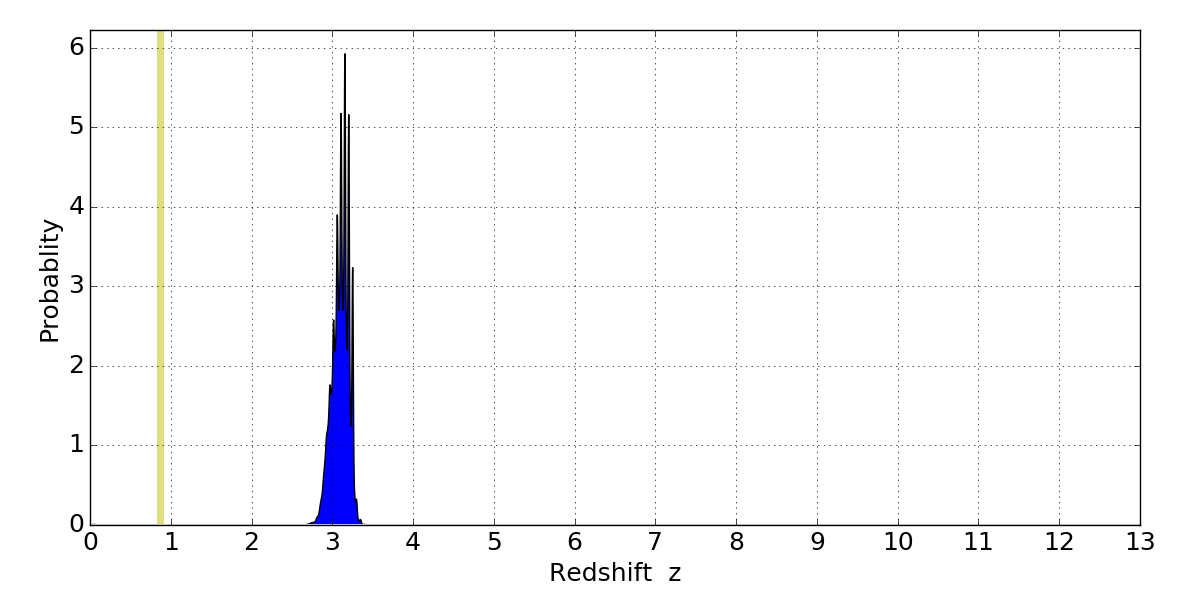 In P(z) plots: Yellow lines mark the cluster redshift z = 0.870,