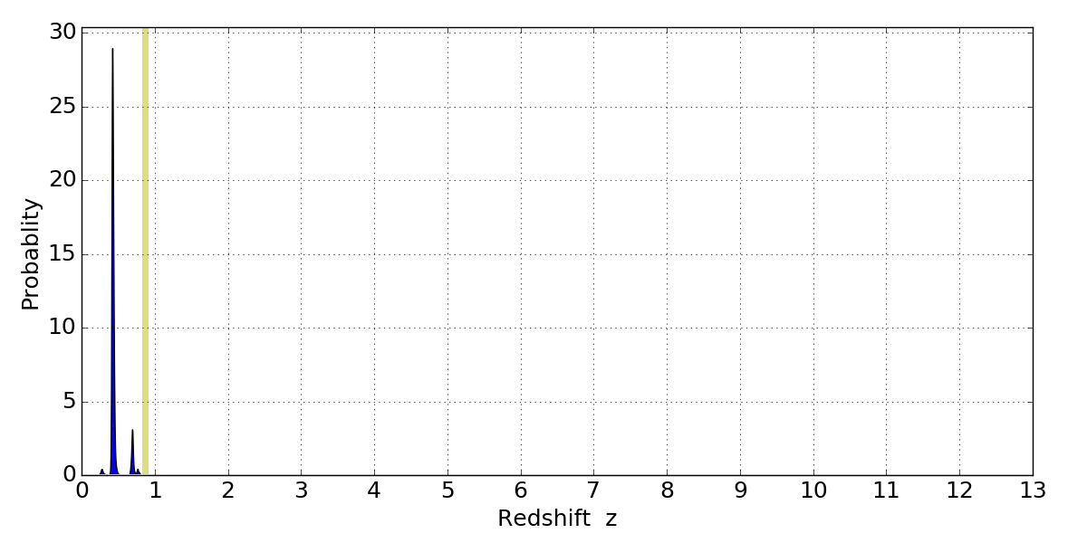 In P(z) plots: Yellow lines mark the cluster redshift z = 0.870,