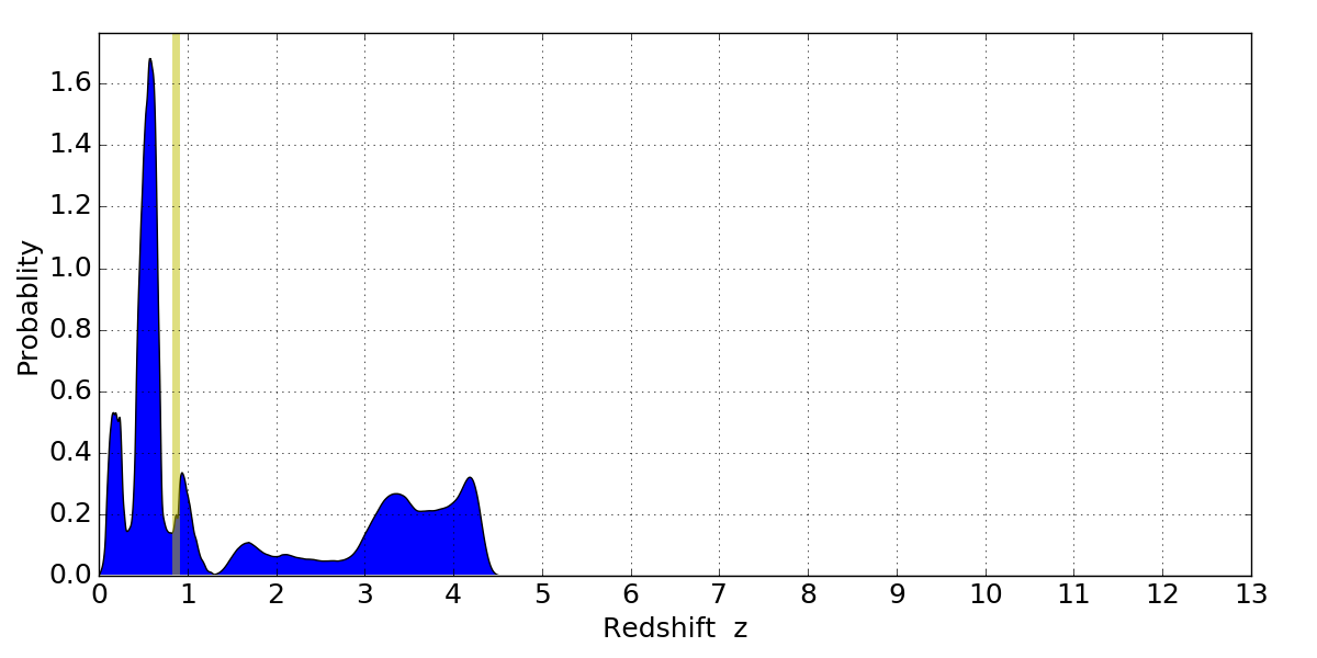 In P(z) plots: Yellow lines mark the cluster redshift z = 0.870,
